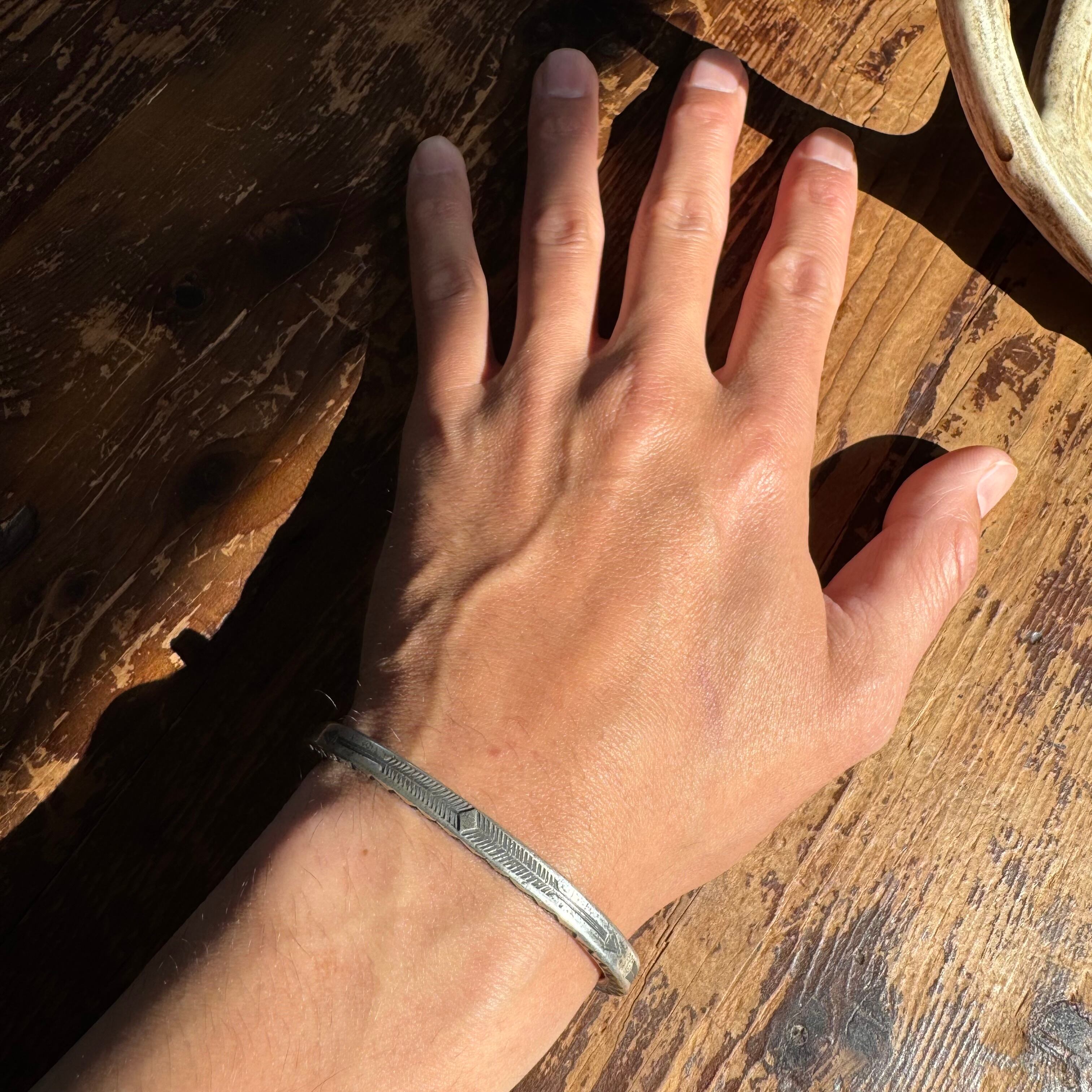 スクエア型のバー状のバングルスタイルで、内側以外の三面にスタンプワーク、彫金が施された一本。