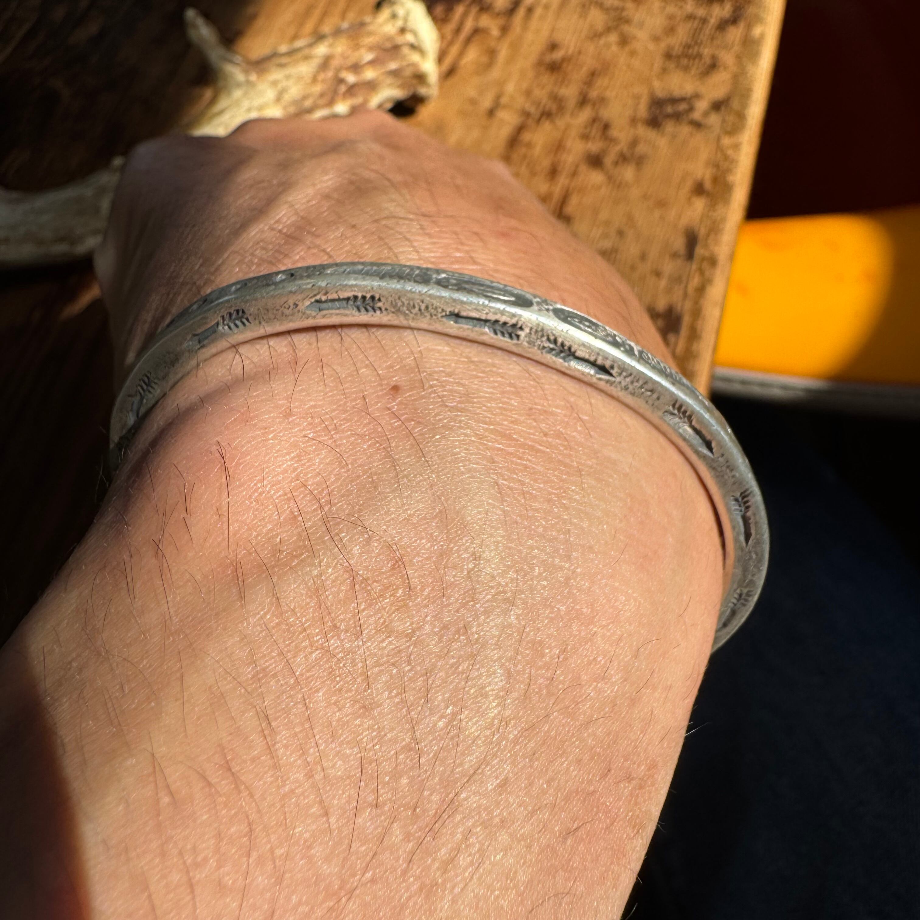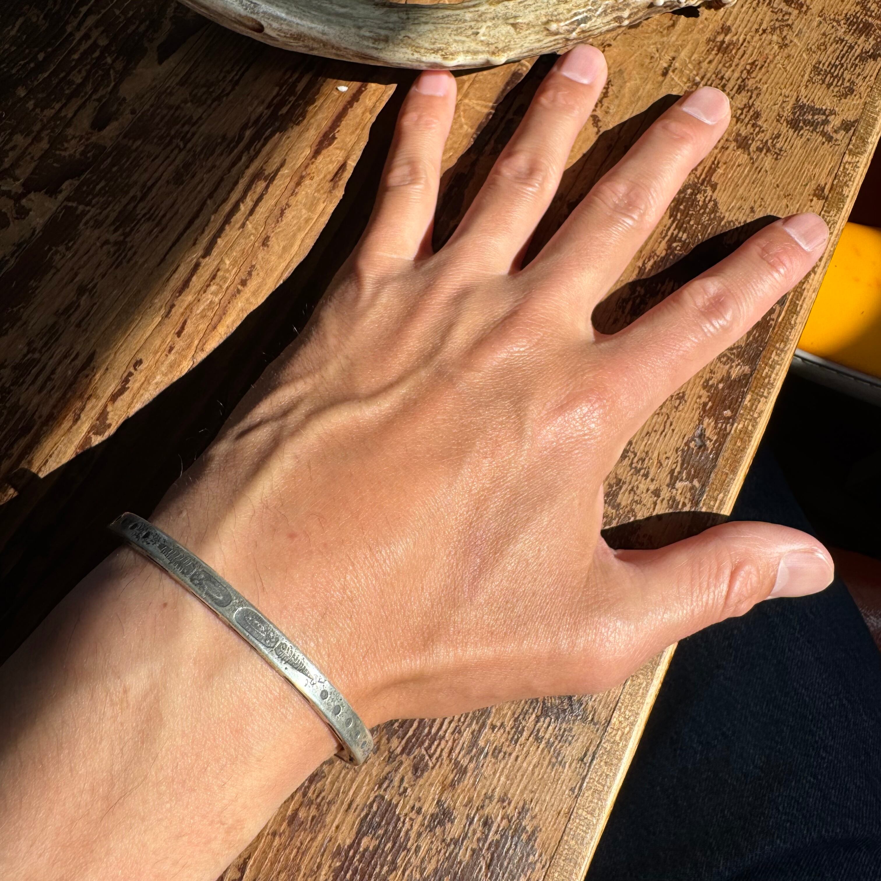 スクエア型のバー状のバングルスタイルで、内側以外の三面にスタンプワーク、彫金が施された一本。