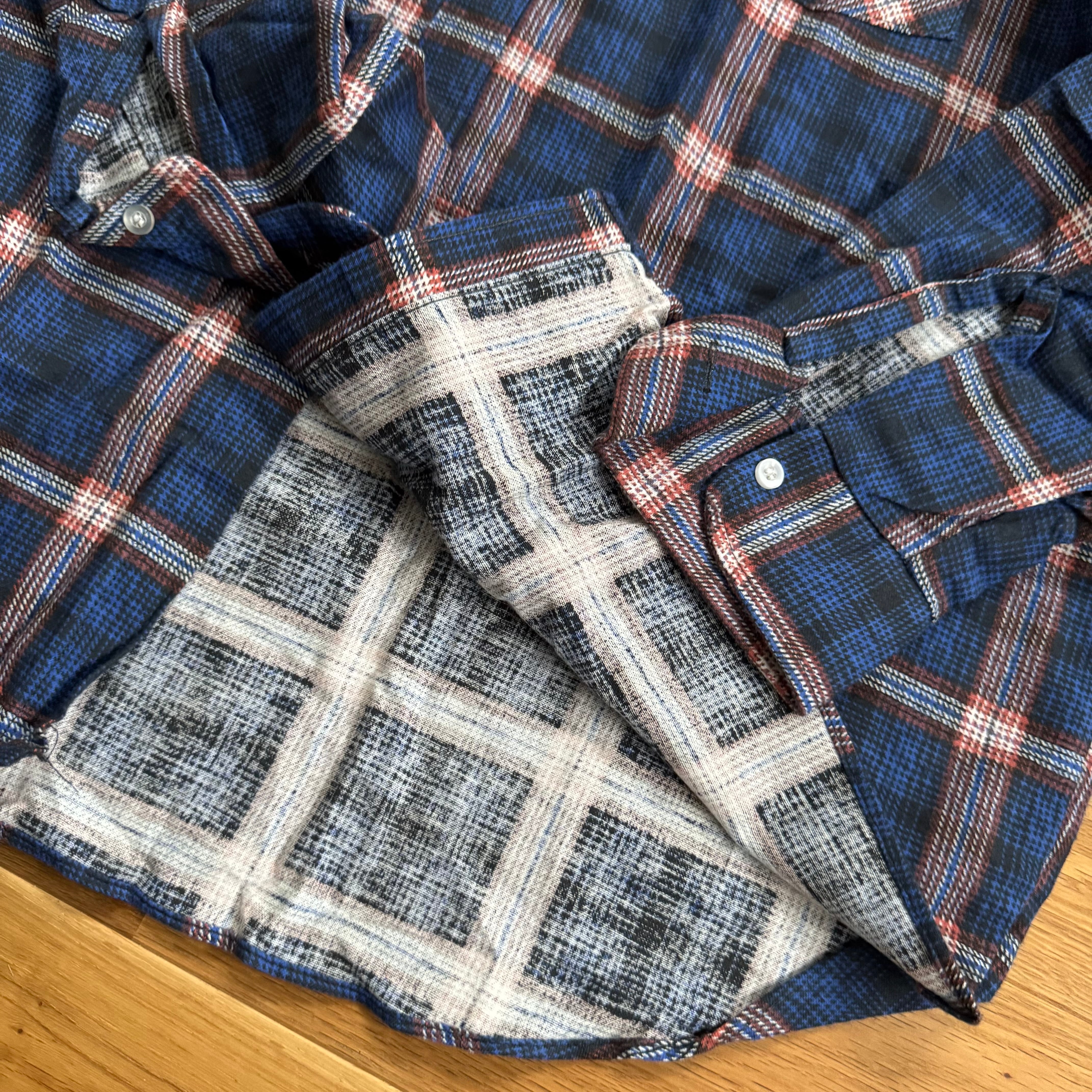 ここが一般的に『ヘビーネル』と呼ばれる、糸と糸の重なり、織りによって柄を出しているネルシャツやウール製品で地厚なシャツとの大きな違い。