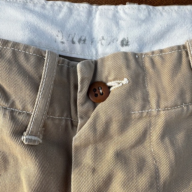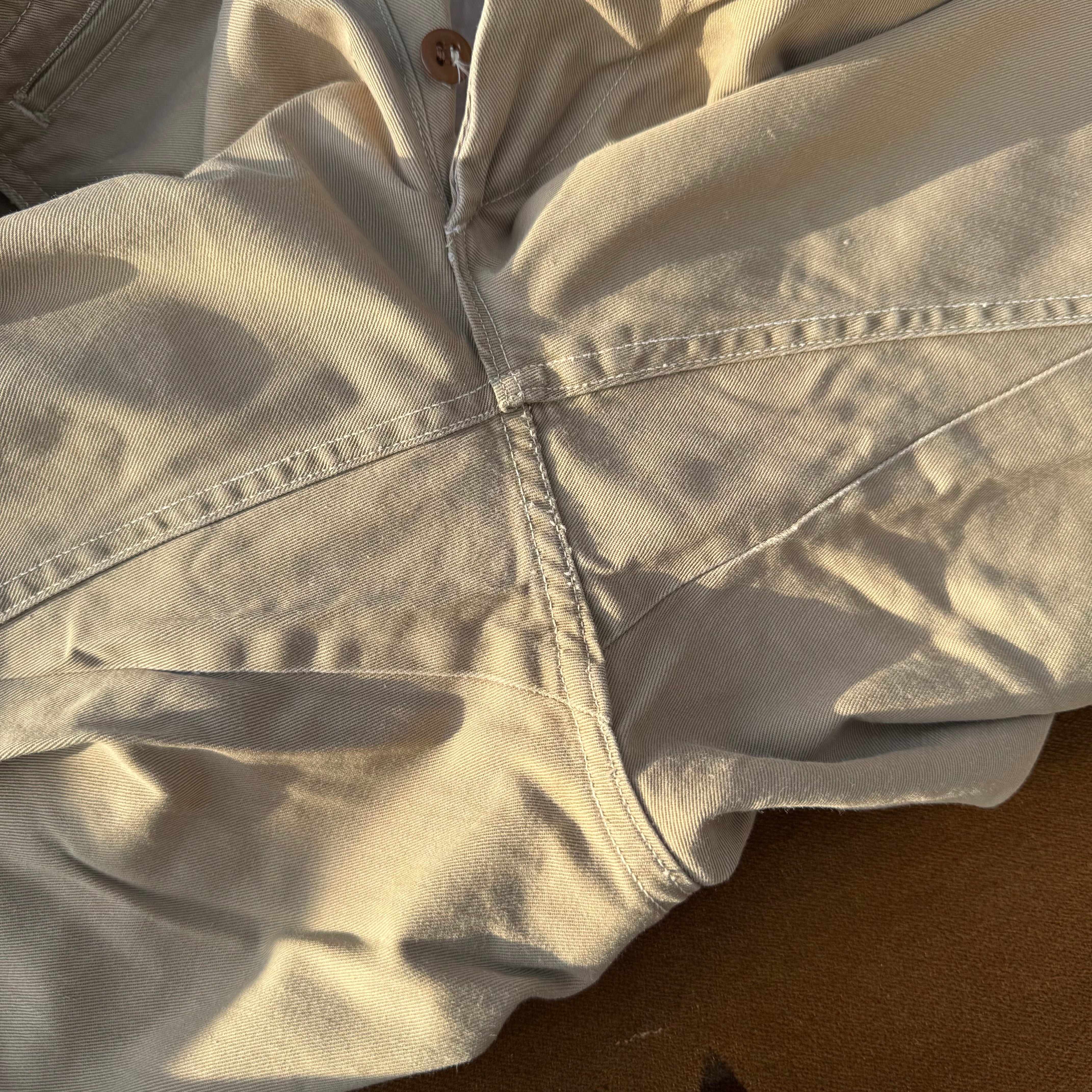 サイドシームとともに内股も全てダブルステッチで、さらに股下のガゼットあたりの縫製ディテールは他にあまり見かけない?仕様で各所のステッチの糸も通常よりやや白いような?単に個体差なのか、仕様、モデルの違いなのかは定かではありませんが..移行期だったり、支給先、工場の違いだったり、軍ものにはこんなちょっと通常と違う個体があったりします。