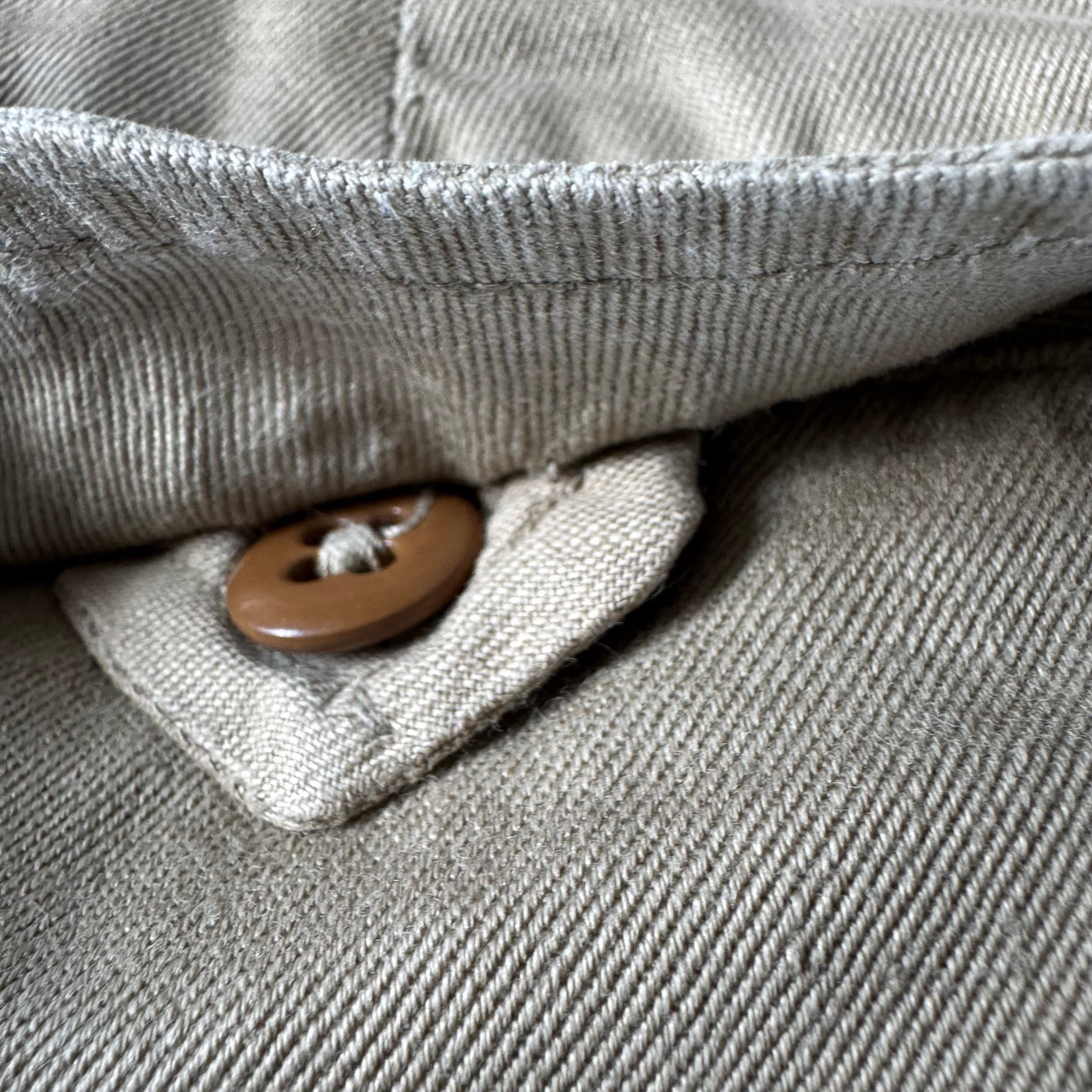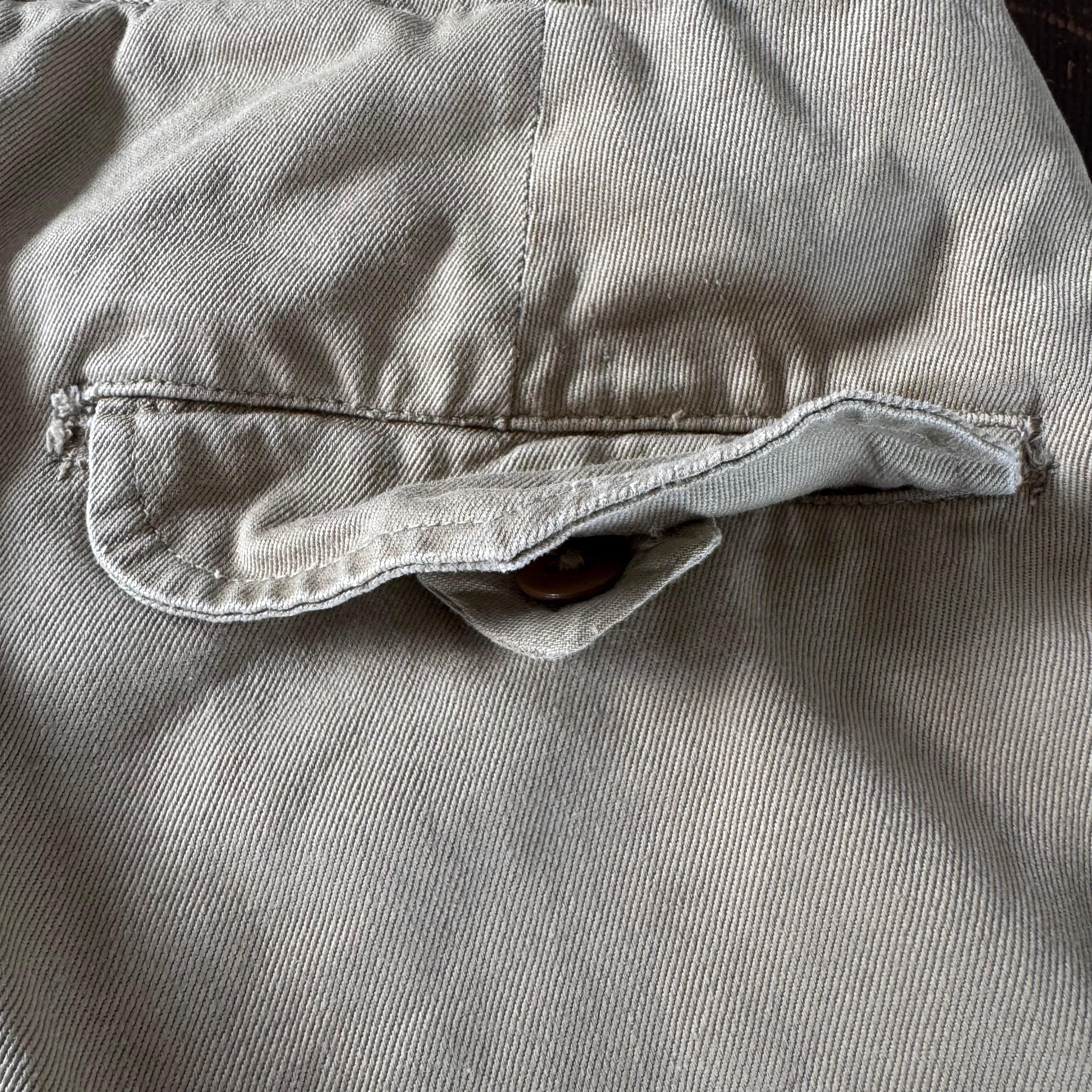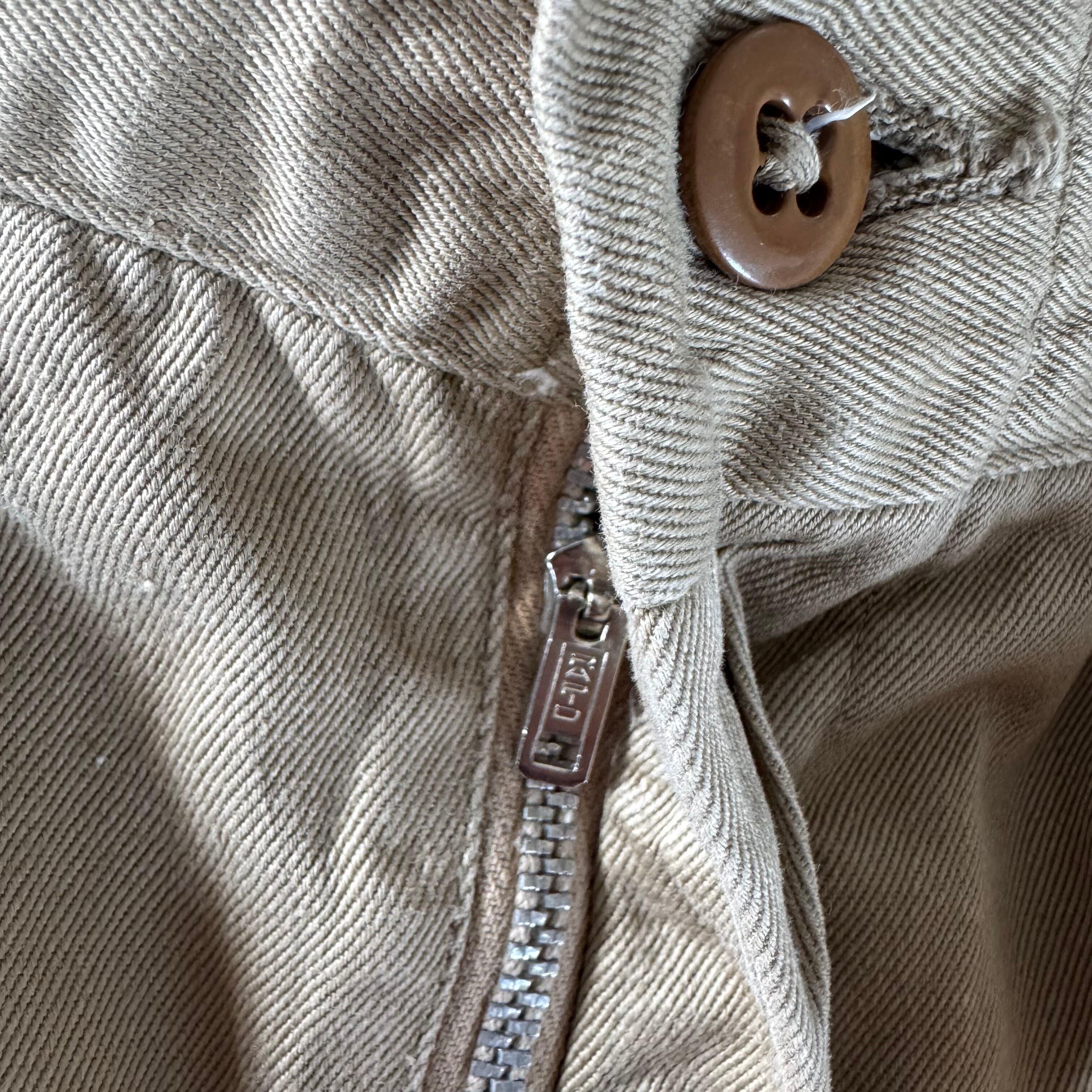 サイドポケットは斜め、バックポケットはフラップ付きの作りになっていて、尿素ボタンを使ってます。尿素ボタンとは、ユリア樹脂、すなわち尿素樹脂をつかったものでプラスチック樹脂がまだ開発されていない時代のパーツ。フロントはRAPIDアルミジッパーフライ