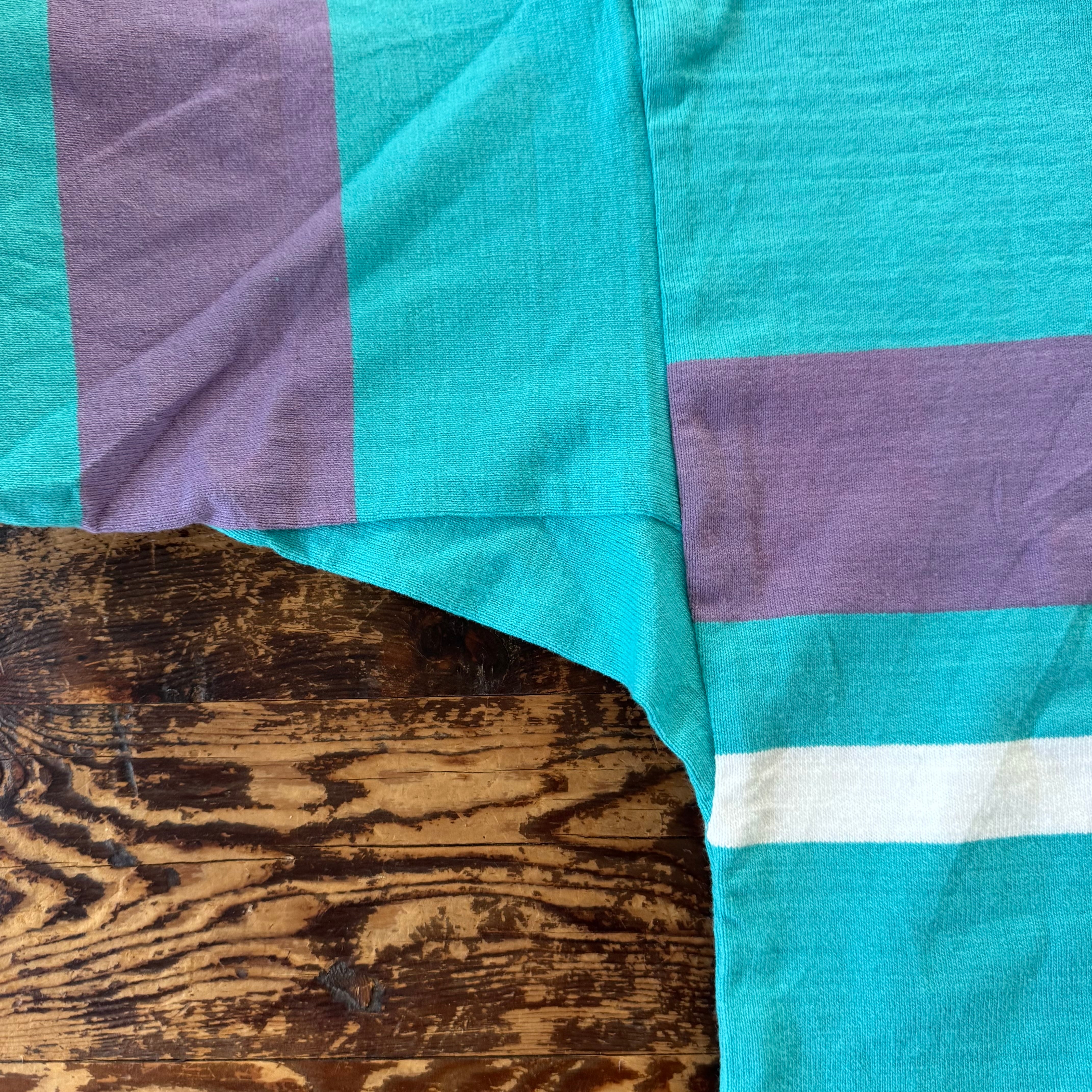 どこかレトロな感じのする、パステルカラーのラガーストライプが印象的な一枚です。