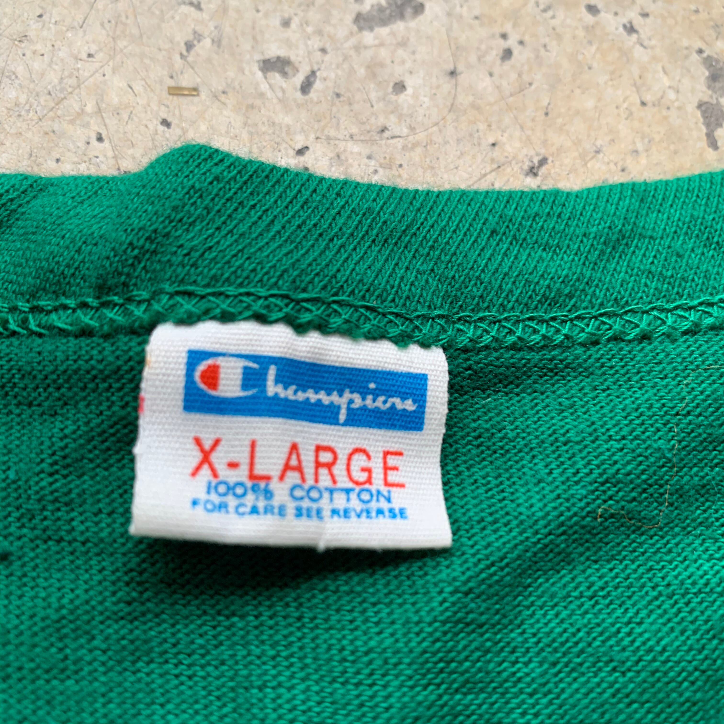 1970年代当時のオールドのコットンボディ。バータグ搭載のバインダーネックに袖に入るラインで人気の仕様です。着込むほどに味わいを増す、チャンピオン特有のグリーン、この時代らしいラバープリントの雰囲気もとても良いように思います。