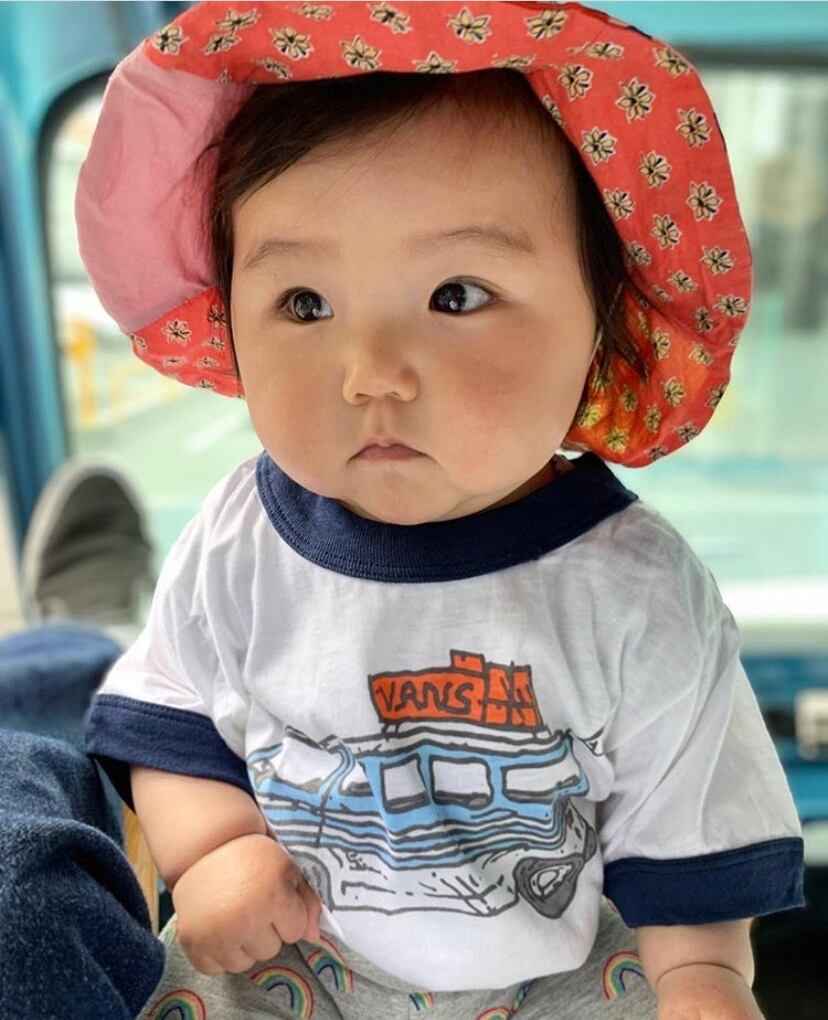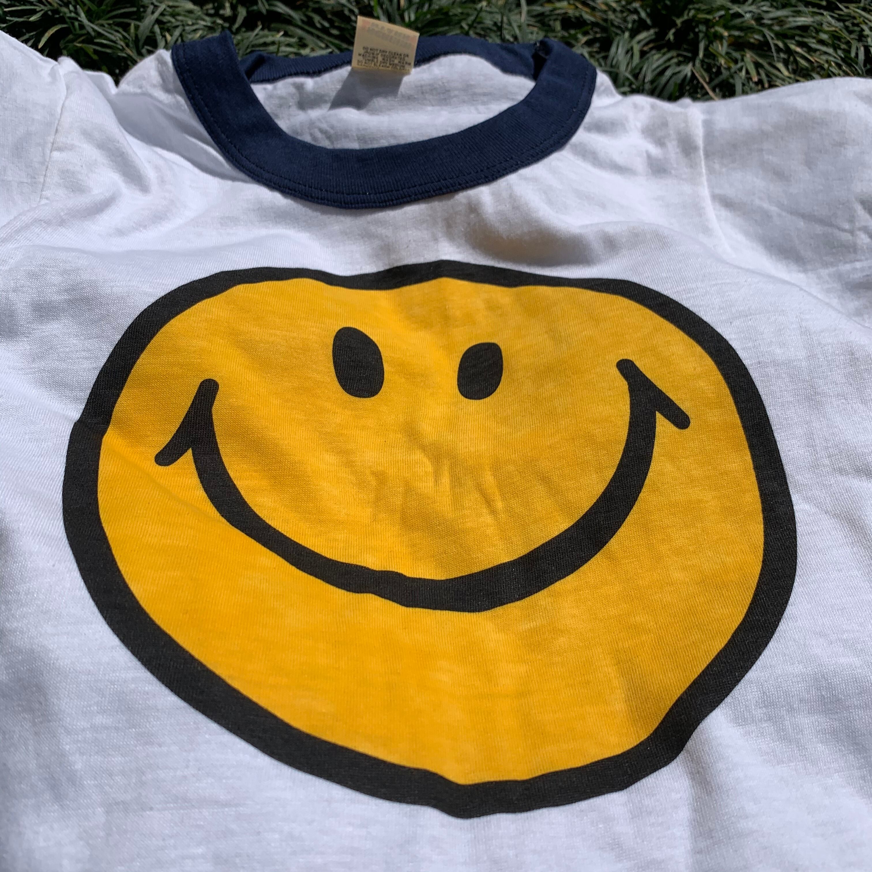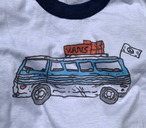 胸に大きめのバランスでプリントしたのは、当店の看板のバンと、愛と平和の象徴スマイリーフェイス。バンの絵はカリフォルニア在住のアメリカ人の友達に描いてもらい、ニコちゃんの方は60年代当時のヴィンテージのワッペンからトレースしました。