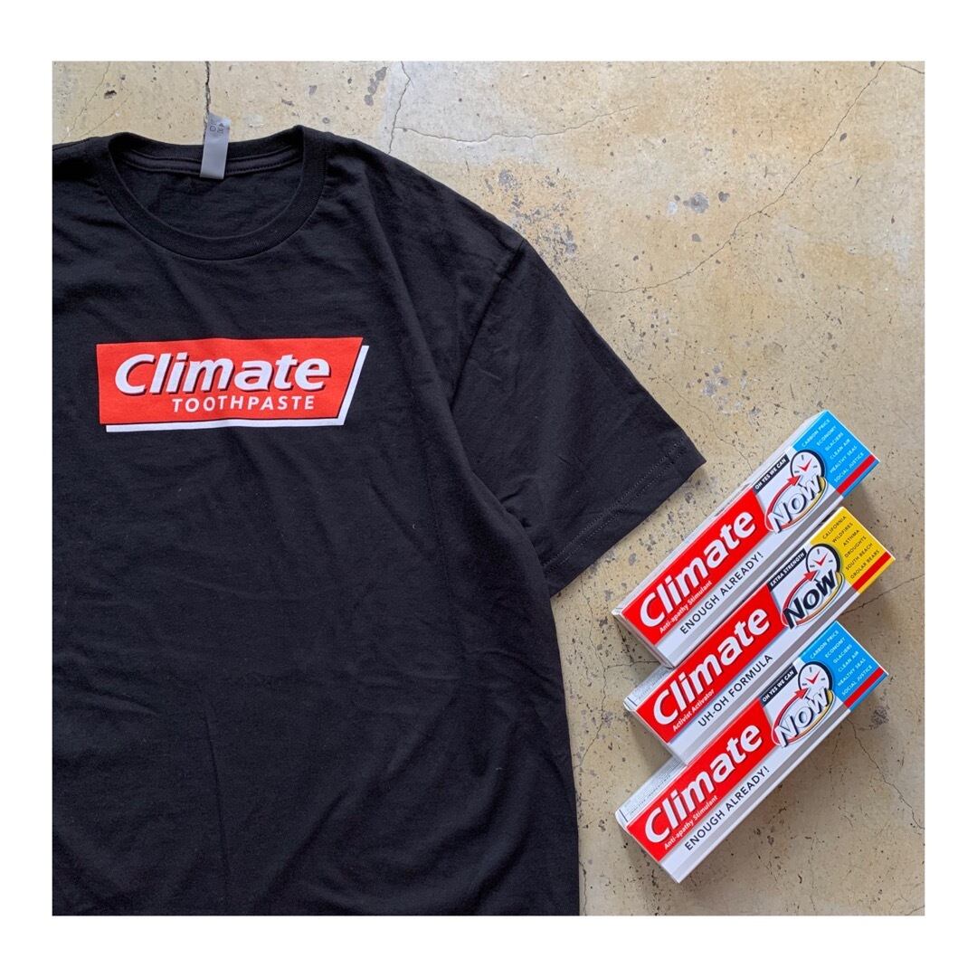 Each shirt comes with a "Toothpaste Box" that presents the urgency of the climate problem in an unexpected but familiar format--the familiar graphics and imagery are confusing, giving the viewer time to reconsider the messages about climate change. Inside the box is a printed message about how you can connect with national and local climate organizations.