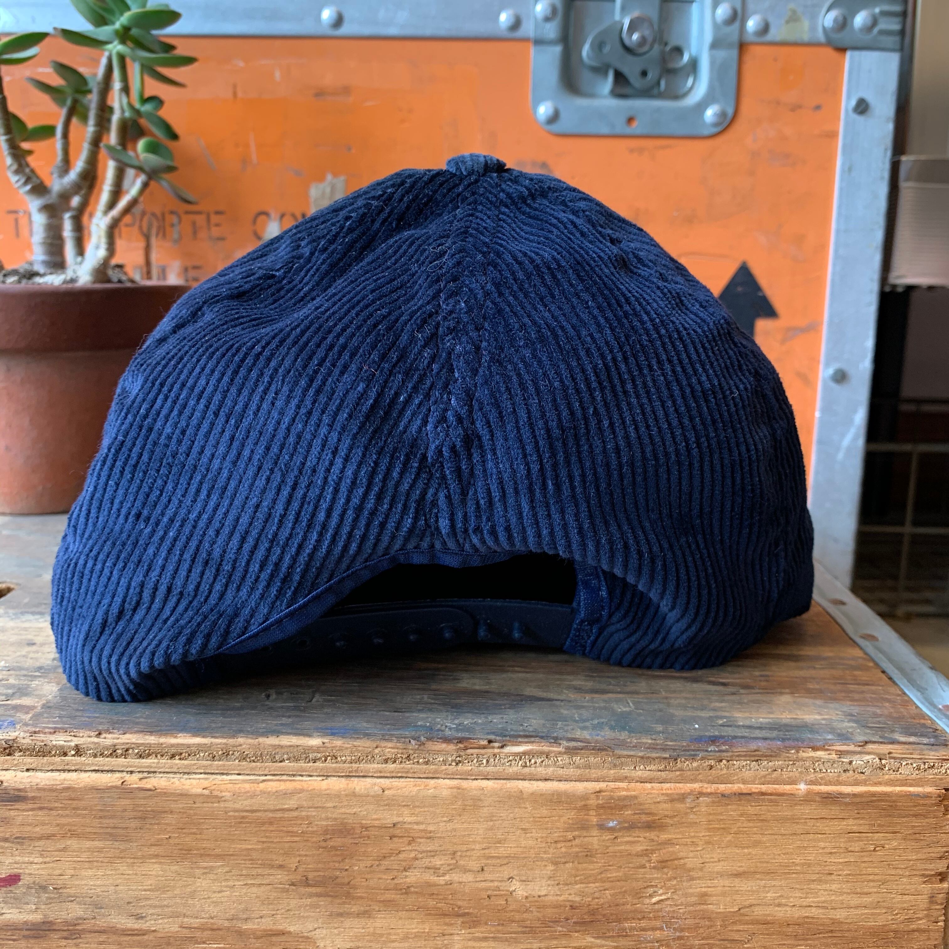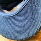 コーデュロイ素材特有の深いネイビーに映える、大きな入る刺繍ロゴが印象的