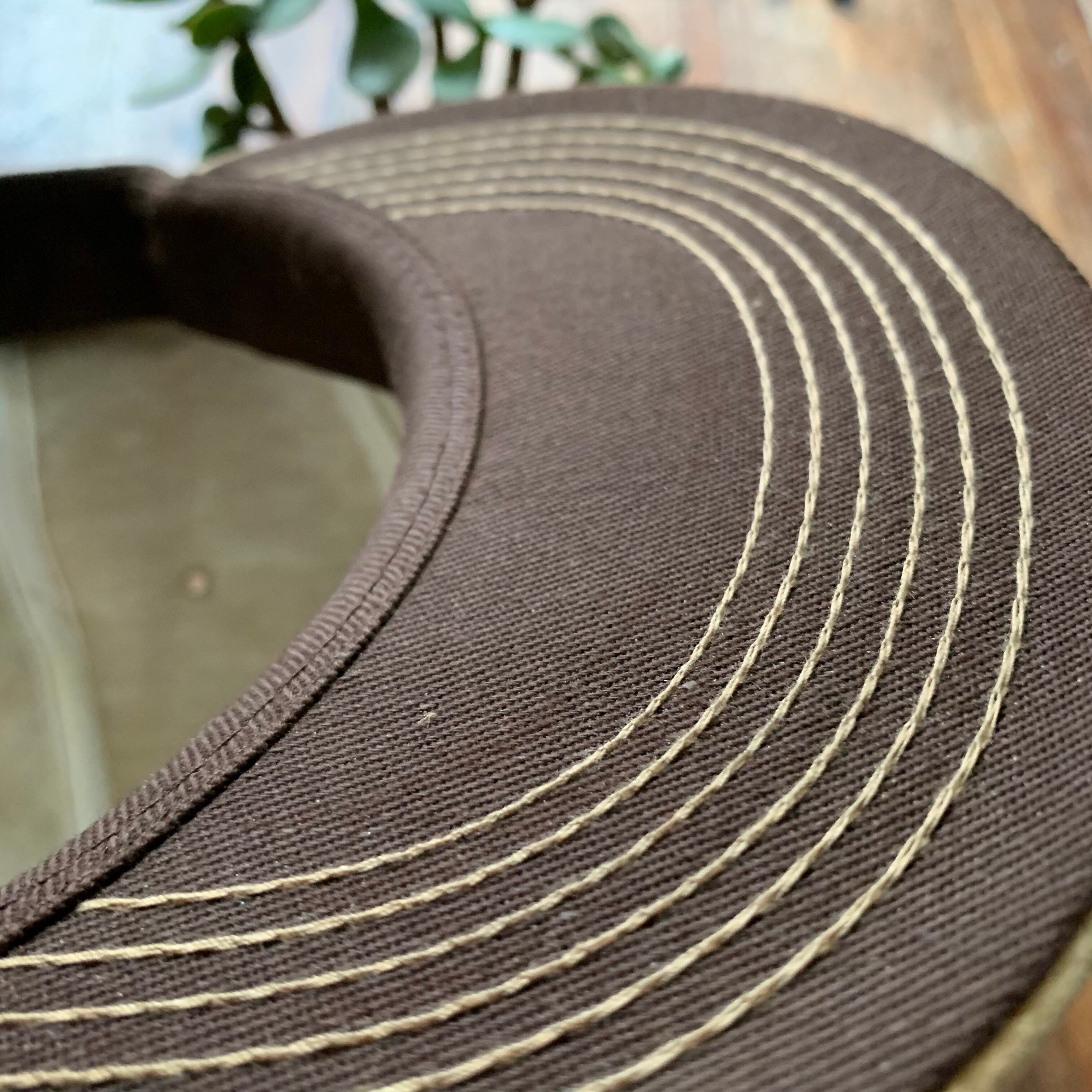 しっかり深めの被り、バイザー裏のチェーンステッチ、ブラウンの汗止めにスナップバック。