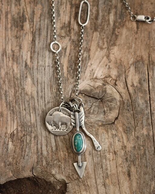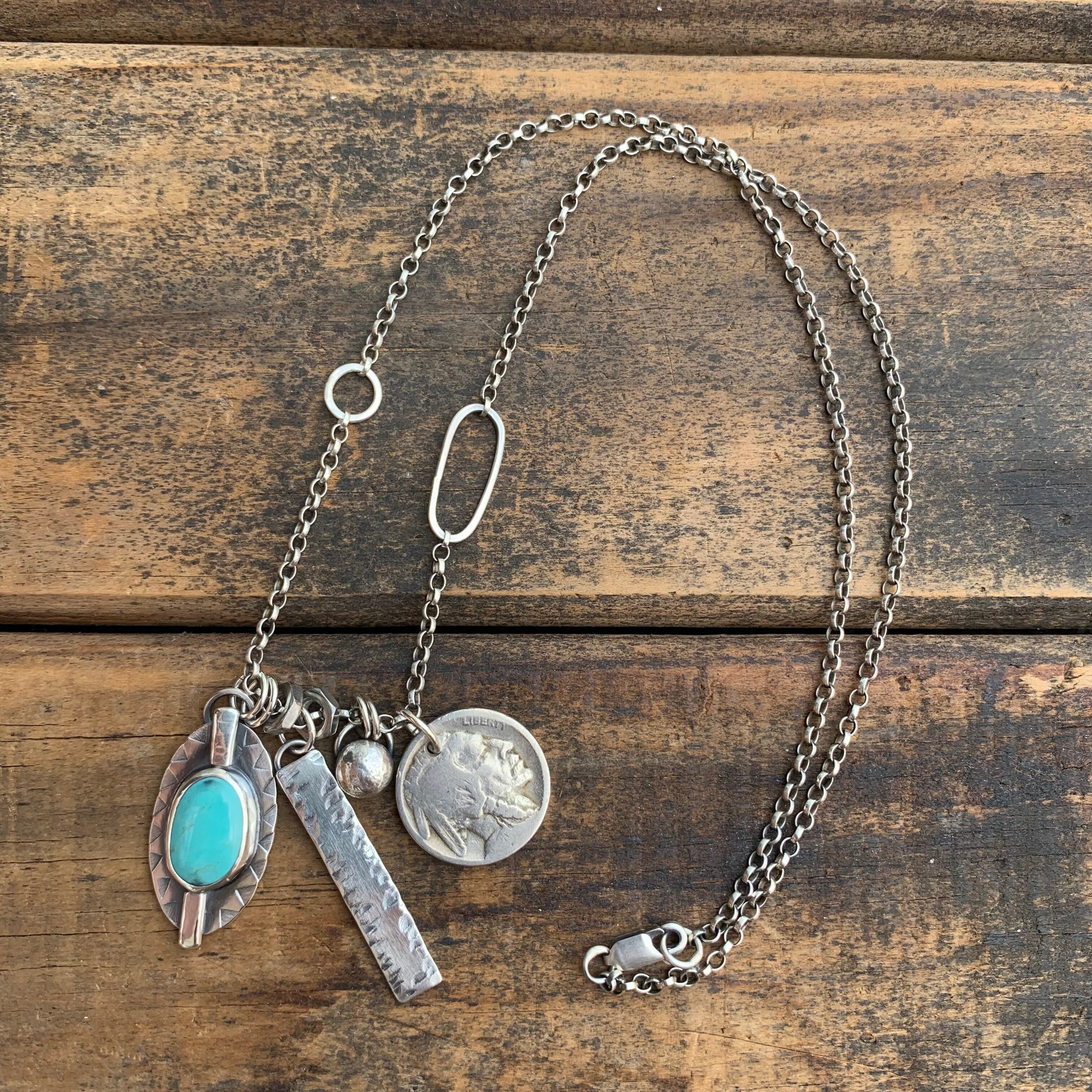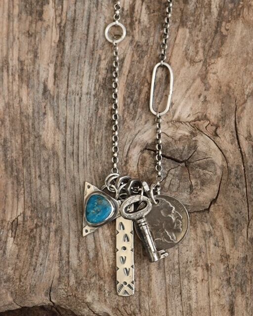 A- Handmade sterling silver with Alpine Blue turquoise + arrowhead, handmade sterling silver bar pendant with hand stamped details, antique key + 1930s Indian head nickel on a reworked sterling belcher chain with handmade links - necklace measures 22”