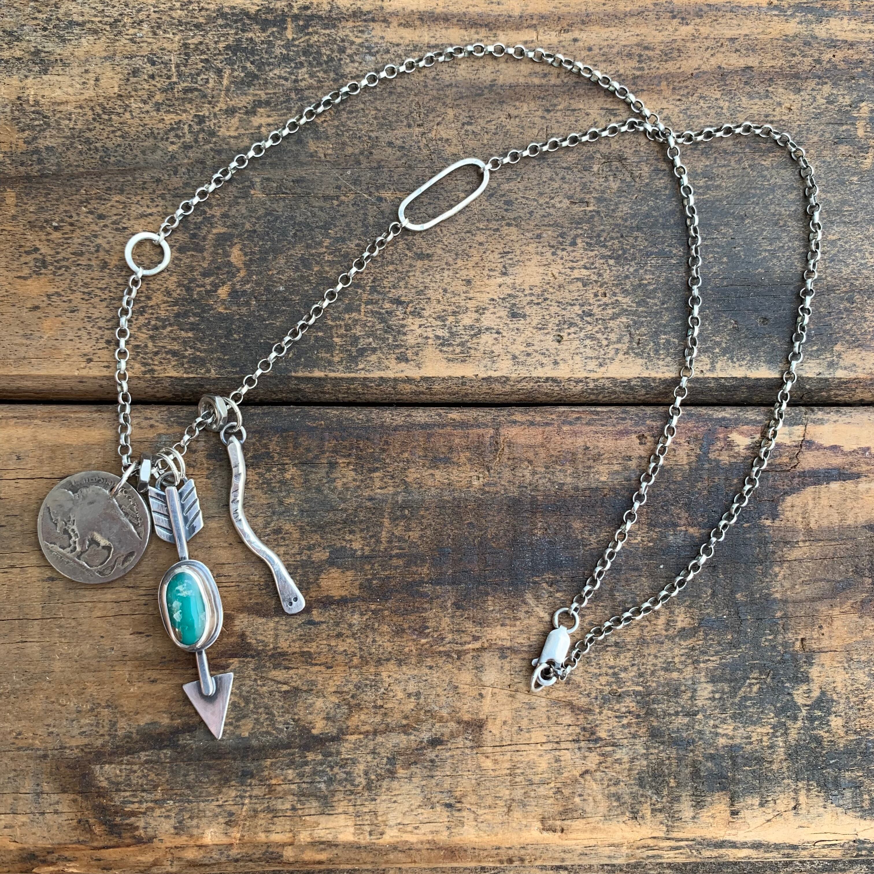 B - Handmade sterling silver arrow with Campitos turquoise, handmade sterling silver snake with a 1930s Buffalo nickel on a reworked sterling silver belcher chain with handmade sterling links - necklace measures 22”