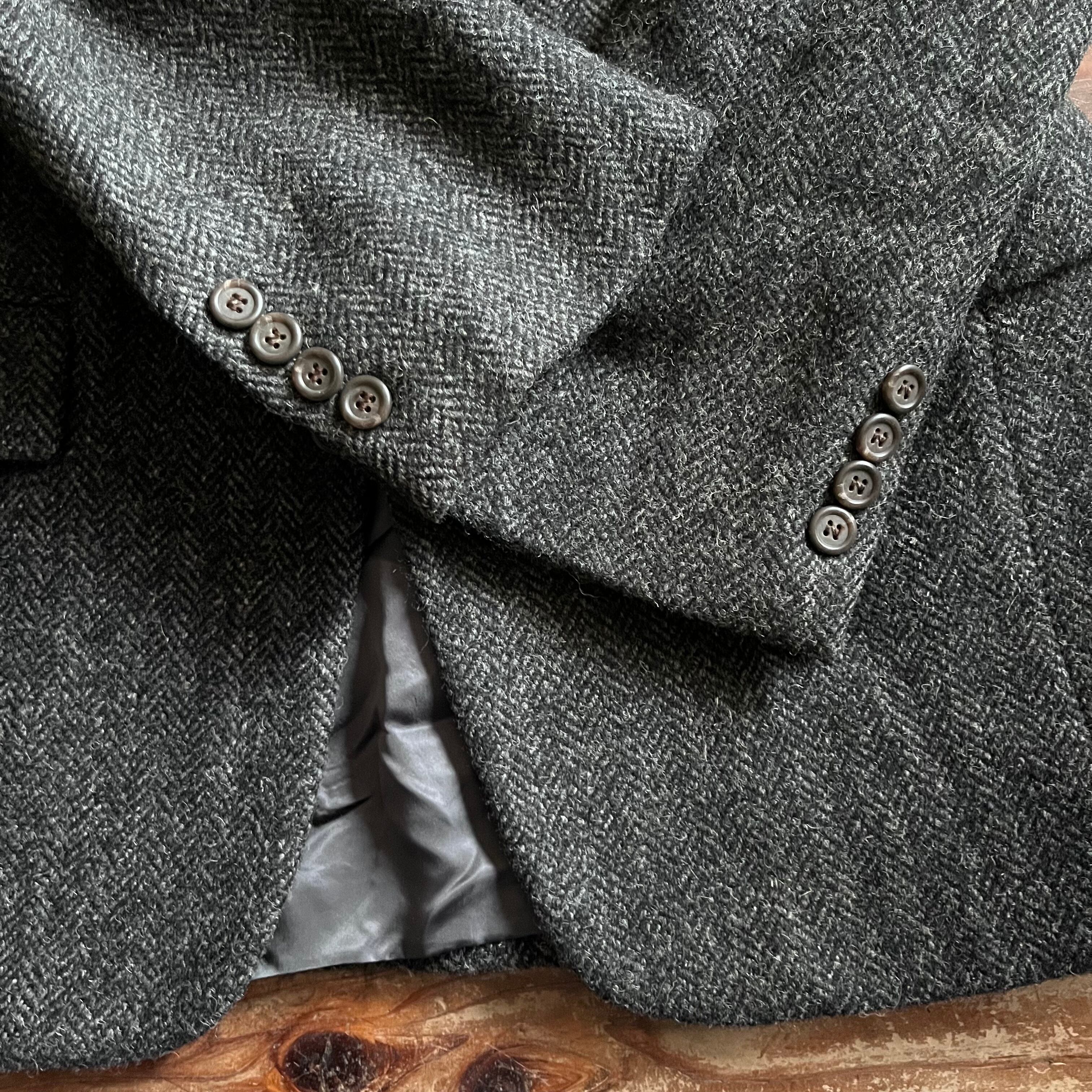 秋冬用のクラシカルなツウィード素材でアウターに使われるような、非常に地厚なツウィードが使われています。温かみのあるルックス、触り心地、質感や細部のディテールからは
